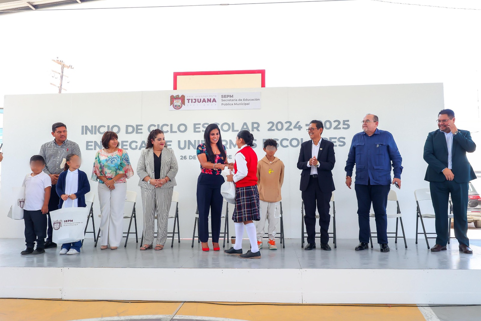 Tijuana, Baja California, a 26 de agosto de 2024.- La alcaldesa Montserrat Caballero Ramírez cumplió con uno de sus compromisos pactados con la población estudiantil, al entregar un total de 2 mil 538 uniformes a igual número de alumnos de los 14 planteles correspondientes a la Secretaría de Educación Pública Municipal (SEPM), donde el XXlV Ayuntamiento invirtió más de 5 millones de pesos.