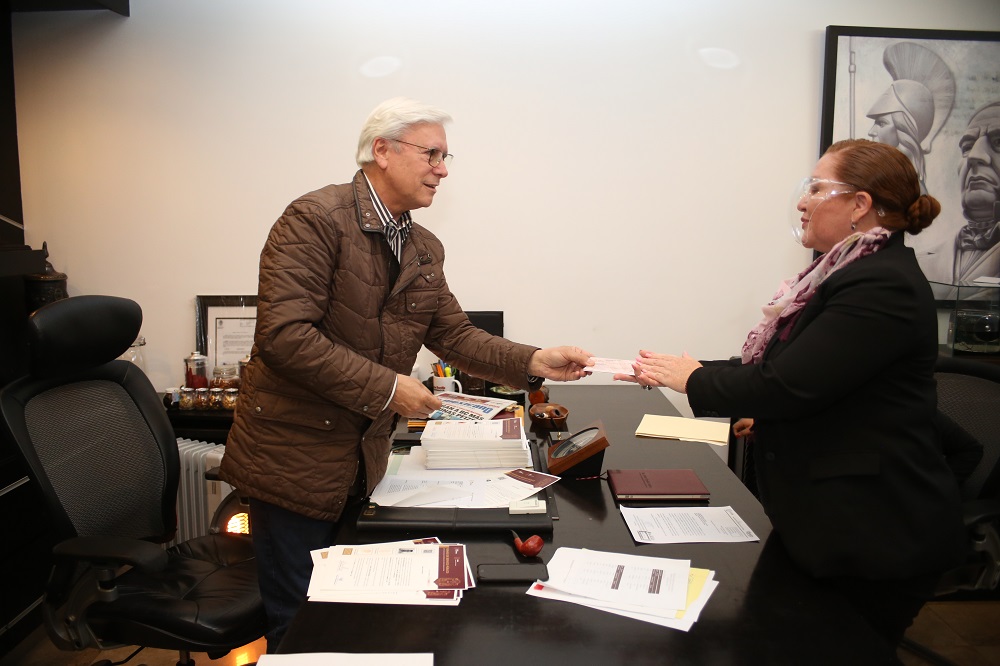 Acompañado de la secretaría de Integración Social y Bienestar Social del Estado, Alma Sarahí Arellano Rosas, el mandatario estatal, recibió, en su despacho de Centro de Gobierno, en Tijuana, a Marisela Camacho Rodríguez, representante de la citada fundación, a quien entregó personalmente el cheque, como muestra de un apoyo solidario a la institución.