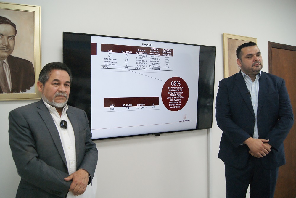Señaló que estarían pendientes 614 casos del ejercicio 2020, para abatir todo el rezago de pago del magisterio, el cual quedará cubierto en su totalidad antes de que termine la actual administración que encabeza el gobernador Jaime Bonilla Valdez.