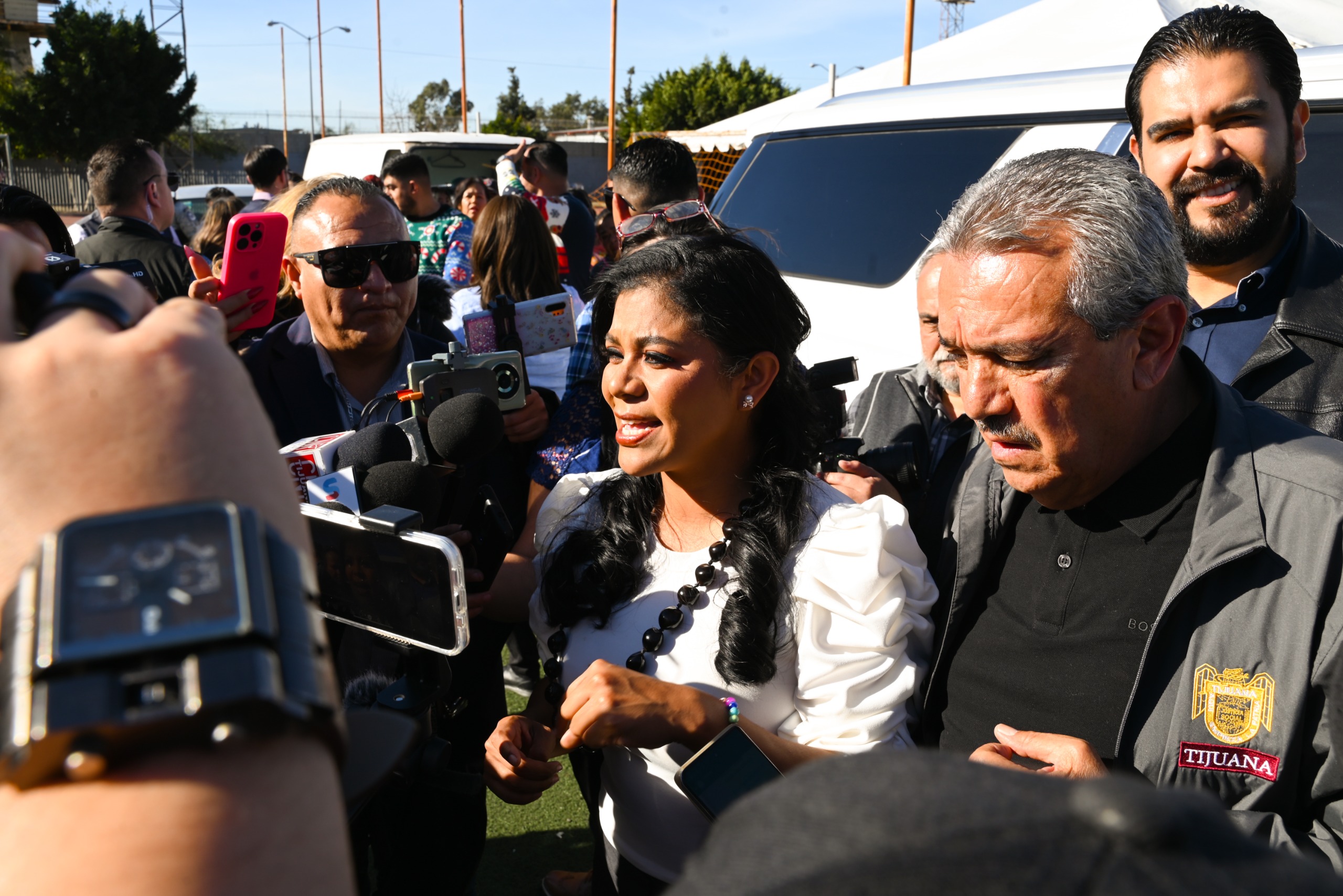 “Me complace saber que voy arriba en todas las encuestas”, aceptó la alcaldesa Montserrat Caballero Ramírez, al responder en rueda de prensa brindada en la Unidad Deportiva Tijuana, al término de la posada realizada a las familias vulnerables de las delegaciones.