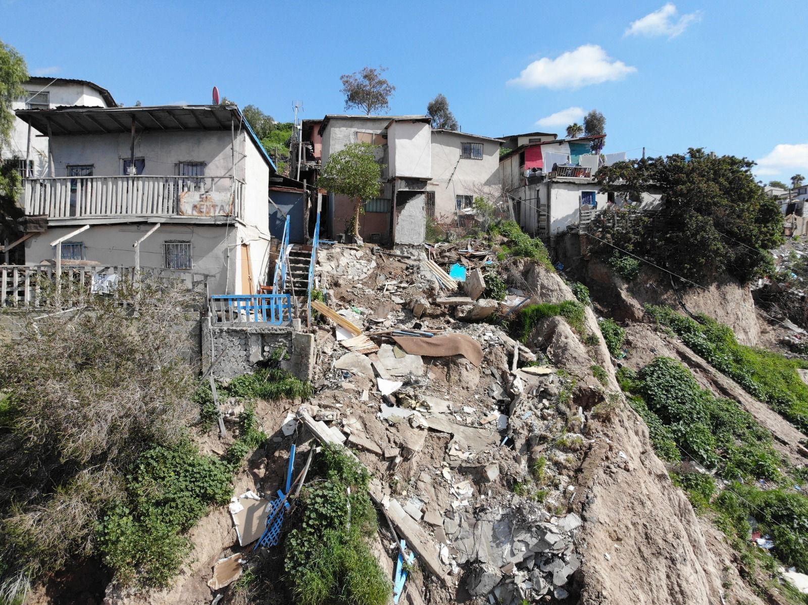 Tijuana, Baja California, 13 de febrero de 2023.- La Dirección de Protección Civil de Tijuana mantiene un monitoreo permanente en una zona del fraccionamiento Herradura Sur, donde se registraron indicios de inestabilidad de ladera, afectando un total de seis predios.
