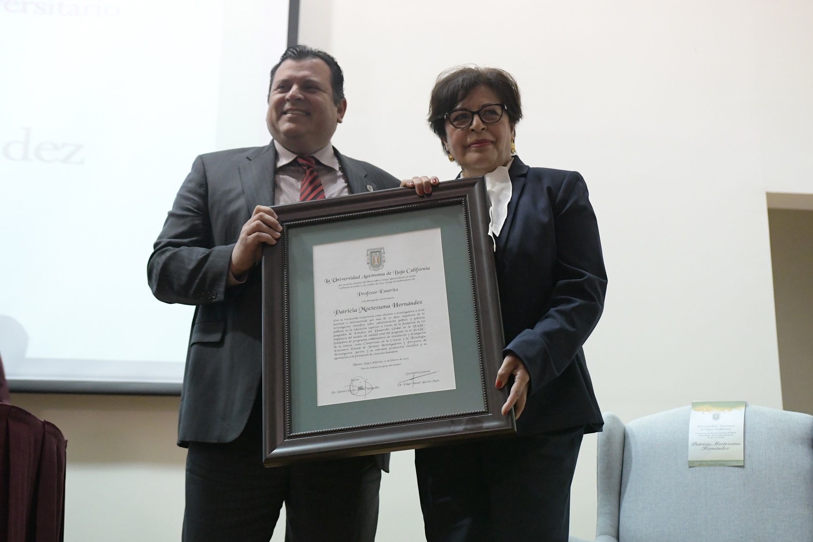 Durante la ceremonia del nombramiento, el rector de la UABC, doctor Daniel Octavio Valdez Delgadillo, indicó que la ahora Profesor Emérito cuenta con amplia deferencia por su trabajo y esfuerzo en el ámbito profesional, conjugados con su implacable lucha para brindar mayores oportunidades a las mujeres y quienes menos tienen.