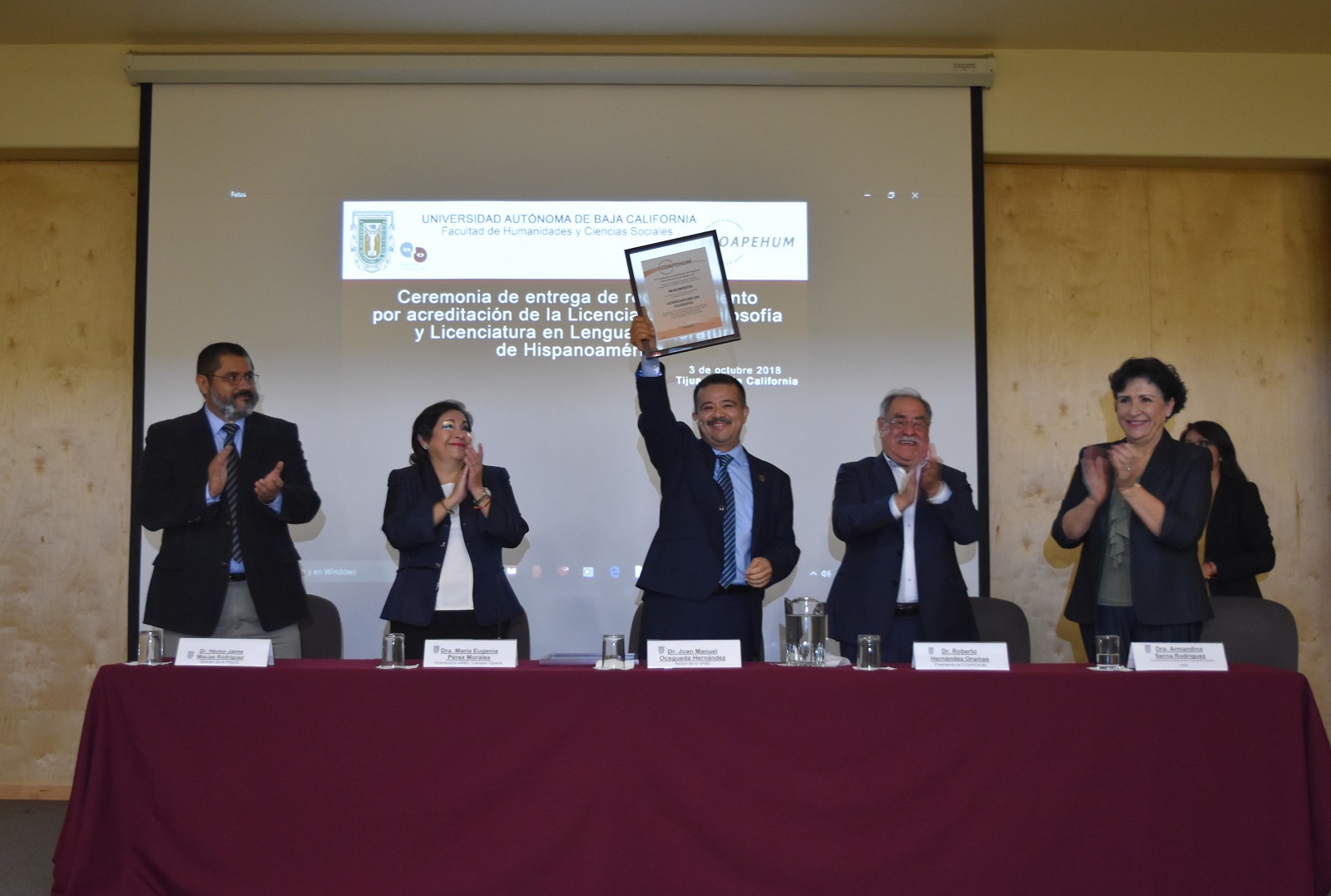 Entregó la constancia de la acreditación el doctor Roberto Hernández Oramas, Presidente de Coapehum, quien mencionó que al otorgar por segunda ocasión consecutiva este documento se confirma la mejora continua realizada por esta unidad académica durante los cinco años después de emitida la primera acreditación. Uno de los aspectos que destacó es el avance en la consolidación de una planta académica capaz de incentivar al estudiante para que avance y se integre en la transformación de la sociedad a través de las humanidades.