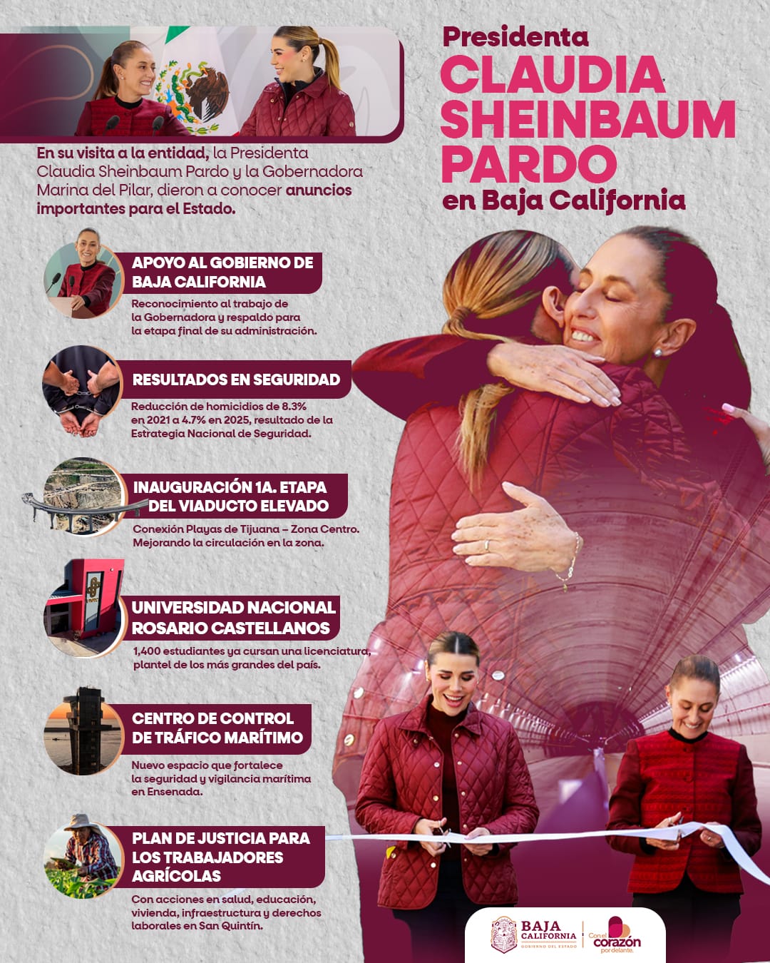TRABAJO CONJUNTO, RESULTADOS Y RESPALDO AL GOBIERNO DE MARINA DEL PILAR MARCAN LA VISITA DE LA PRESIDENTA CLAUDIA SHEINBAUM A BAJA CALIFORNIA